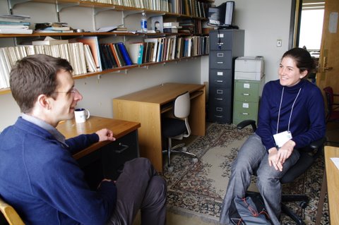 mcgeeandzakem November 1, 2011Full resolution ( × ) ← Previous Next → David McGee talks with prospective graduate student Emily Zakem at the 2011 Joint Program/PAOC Open House.